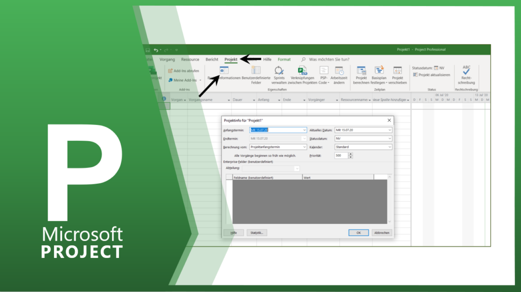 Sie müssen im Fenster Projektinfo den Projektanfangstermin bzw. –endtermin festlegen (handelt es sich um eine Vorwärts- oder Rückwärtsrechnung). Danach geben Sie den Anfangs- bzw. Endtermin…